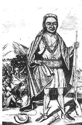 Portrait of Metacomet, leader of the Pokanokets group ["King Phillip" to the English] from an engraving by Paul Revere.