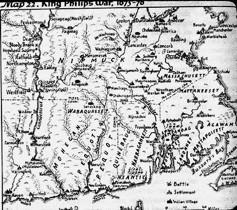King Phillip's War was named for "Metacomet" known as "King Phillip" to the colonists, leader of the Pokanokets, a member tribe of the Wampanoag Indians. It began either when the English executed three Native Americans for murder or when a farmer killed an indian in retaliation for killing cattle. No matter the start, this conflict was the one of the bloodiest and most brutal of the period, involving huge battles, sneak attacks - massacres - by the colonists against indians who were not (yet) involved in the war, colonist's towns raided and burned, and worse.